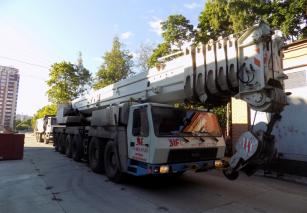 Для установки «башенника» использовался автокран Grove GMK 6220L грузоподъемностью 220 тонн. Работать пришлось в полную мощность при вылете стрелы в 34 метра. Наибольшую сложность представлял этап подъема и монтажа поворотной части, ее вес составлял 9 тонн.
