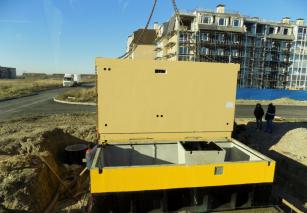 Для выполнения аналогичных работ в нашей компании был арендован 60-тонный автокран Liebherr, управляемый нашим опытным специалистом. Производство работ по перемещению груза в виде трансформаторной подстанции оказалось довольно непростым делом – автокран пришлось привести в оснащенное состояние вплотную к котловану, где находились уже установленные кабельные этажи. Кроме этого, перемещение подстанции с транспортной платформы, на которой она была доставлена от производителя в упакованном состоянии, осуществлялось под предельной нагрузкой – масса подстанции едва подходила под максимальную грузоподъемность автокрана. Тем не менее, монтаж БКТП был успешно выполнен за короткое время.