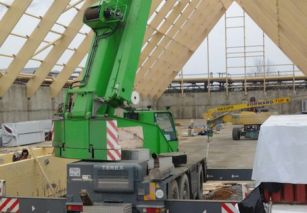Наш 40-тонный автокран Terex-Demag AC-40 City снова был арендован для монтажа пролетов на производственном здании в Кингисеппе, где ранее работал в паре с 70-тонным Liebherr. По предыдущей заявке 40-тонник занимался укрупнительной сборкой, а затем в тандеме со вторым автокраном оперативно ставил пролеты. Установка балок одним краном осуществляется значительно медленнее, поочередно можно ставить только по одной балке, но, тем не менее, строительство объекта уверенно продолжается, и наш автокран выполнил предусмотренный объем работ по второй заявке в установленный договором срок.