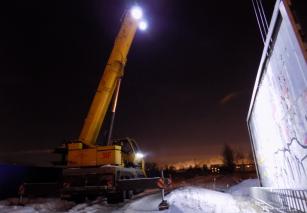 В Таллиннском шоссе наш автокран Grove GMK 4100 L выполнял задачу по монтажу рекламной конструкции. Обычно установка короба с рекламным щитом не вызывает затруднений, но в этот раз работе мешал сильный ветер. Опору поставили быстро, ее вес составлял 6 тонн. Вес щита – 9 тонн, из-за ветра на работу с ним ушло больше времени, но задачу выполнили успешно.