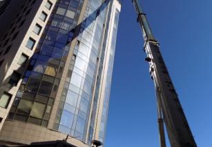 Аналогичную задачу мы выполняли для гостиницы "Санкт-Петербург". Автокран Grove GMK 6220L со стрелой длиной 72 метра подавал новые стеклопакеты для монтажа на верхние этажи и снимал демонтированные. Работа осуществлялась в сложных условиях, сильный ветер затруднял выполнение задачи.