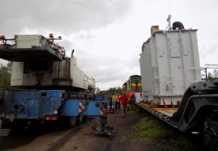 Наша очередная задача заключалась в том, чтобы на ж/д станции Ораниенбаум, г. Ломоносов, снять с железнодорожной платформы и погрузить на автомобильные тралы два трансформатора весом 71,5 тонны каждый. Трансформаторы были перевезены автотранспортом в Новосаратовку, где сразу устанавливались на функционирующей подстанции. Для выполнения всех грузоподъемных работ был задействован наш автокран Grove GMK 6220L.