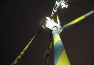 Помочь 36-тоннику оказалось не так просто – Локомо зацепил верхушку ветрогенератора за единственный крепеж, нашему 60-тоннику Liebherr пришлось цепляться за его «паука». Дополнительные сложности добавило отсутствие профессиональных стропальщиков, кроме этого, вращался винт, но после нескольких попыток верх с винтом все-таки удалось благополучно опустить.